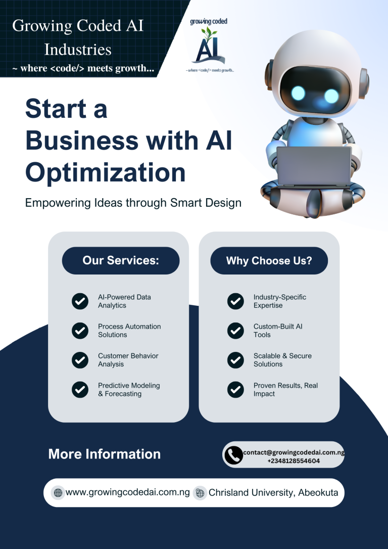 At Growing Coded AI Industries, we help entrepreneurs and organizations unlock new growth opportunities through smart AI-powered solutions. From data analytics and process automation to predictive modeling and customer behavior analysis, our tools are designed to boost efficiency and decision-making.